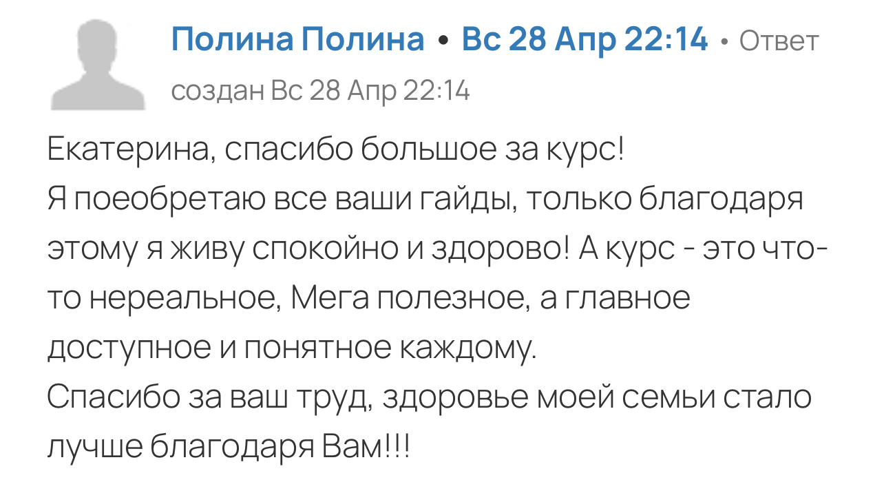 Полный курс содержит все базовые знания основ детского здоровья, полноценного питания и рациона, и многое другое, чего нет в отдельных тарифах. И покупая весь курс целиком, вы сэкономите намного больше!